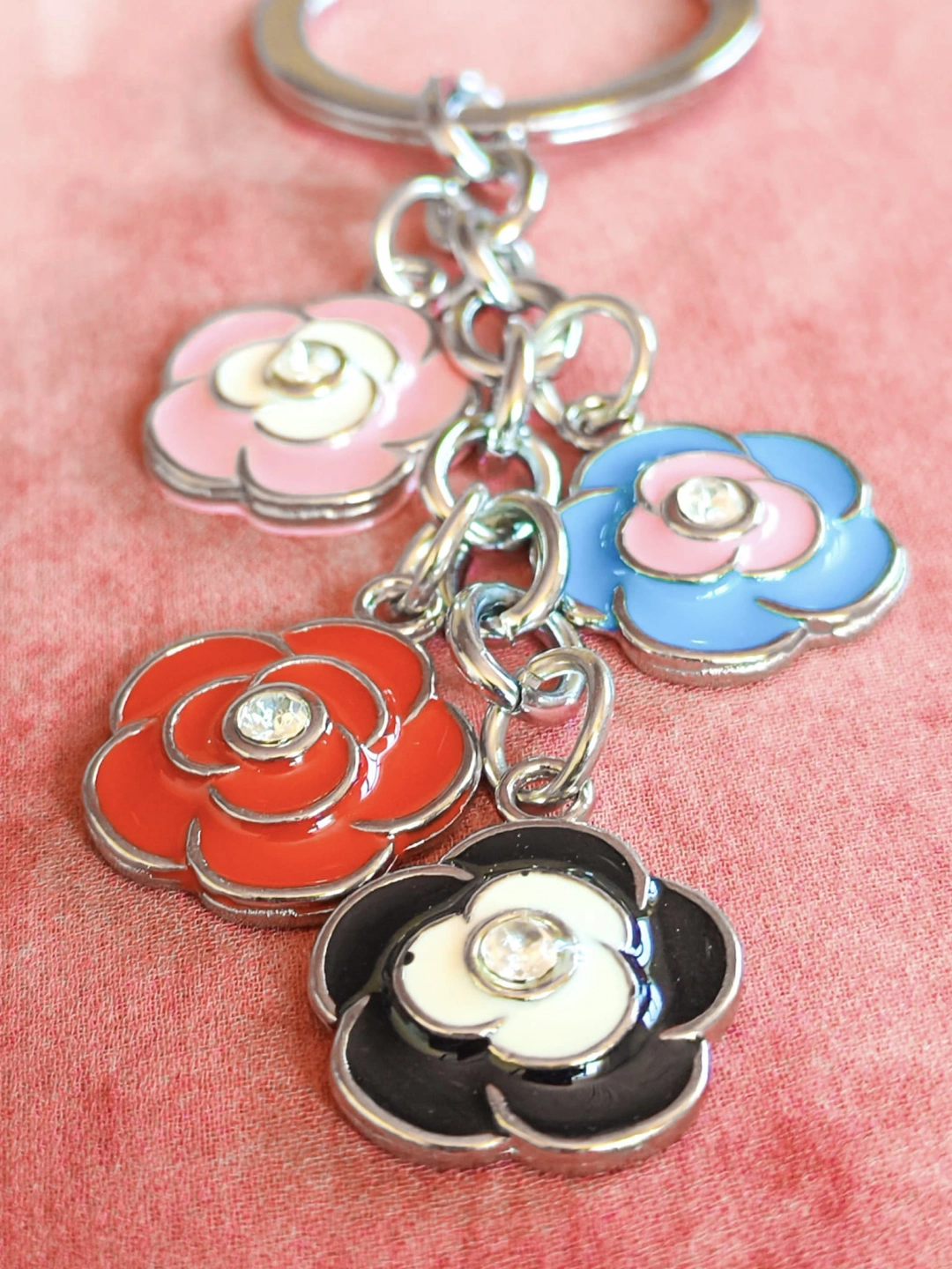 Her Biri Ayrı Zincire Takılmış 4 Renk Gülden Oluşan Metal Anahtarlık – Zarif ve Anlamlı Tasarım