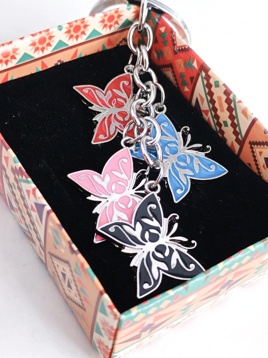 Parlak metal yüzeyi, kaliteli kaplaması ve özenli işçiliği sayesinde uzun ömürlü ve dayanıklıdır. Anahtarlarınıza, çantanıza veya aracınıza takarak hem şık bir aksesuar kullanabilir hem de renklerin pozitif enerjisini her an yanınızda taşıyabilirsiniz. Kelebek figürleri ışıkla buluştuğunda ortaya çıkan ışıltı, sade kombinlere bile canlılık ve zarafet katar.