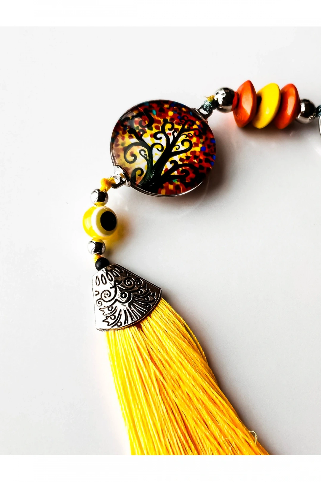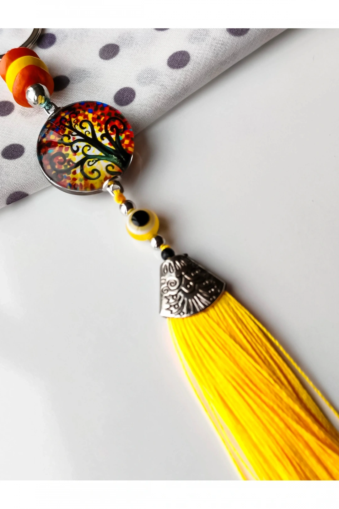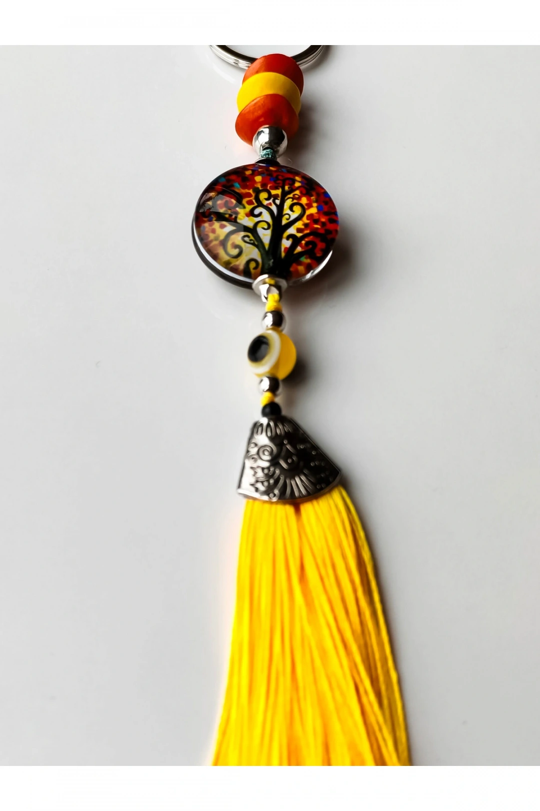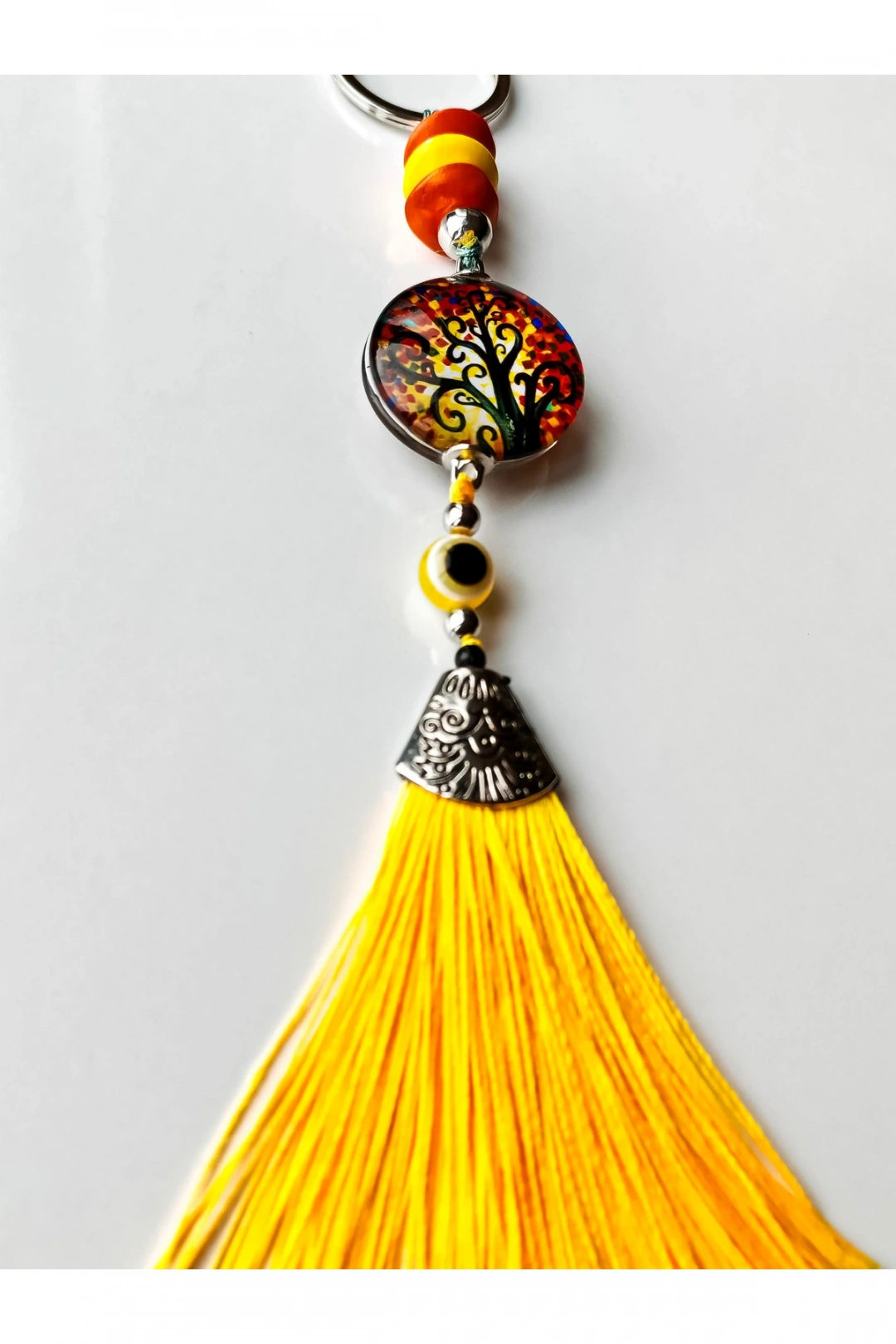 Sarı Cam Hayat Ağacı Desenli Sarı Püsküllü Anahtarlık