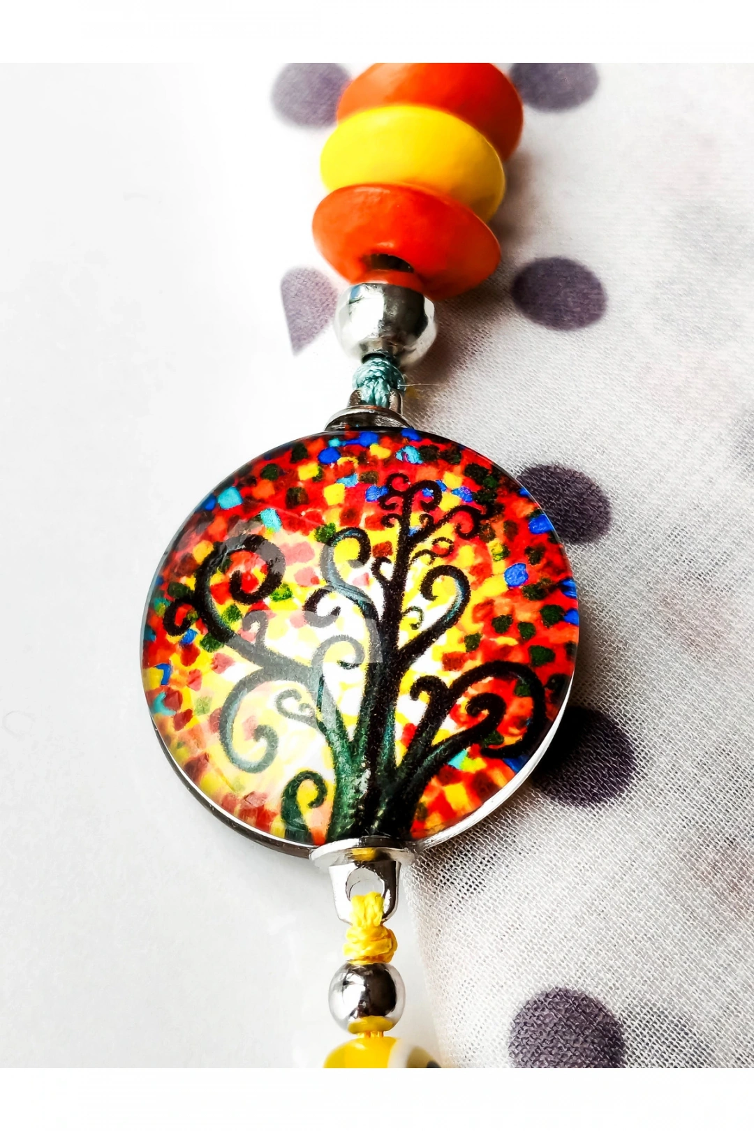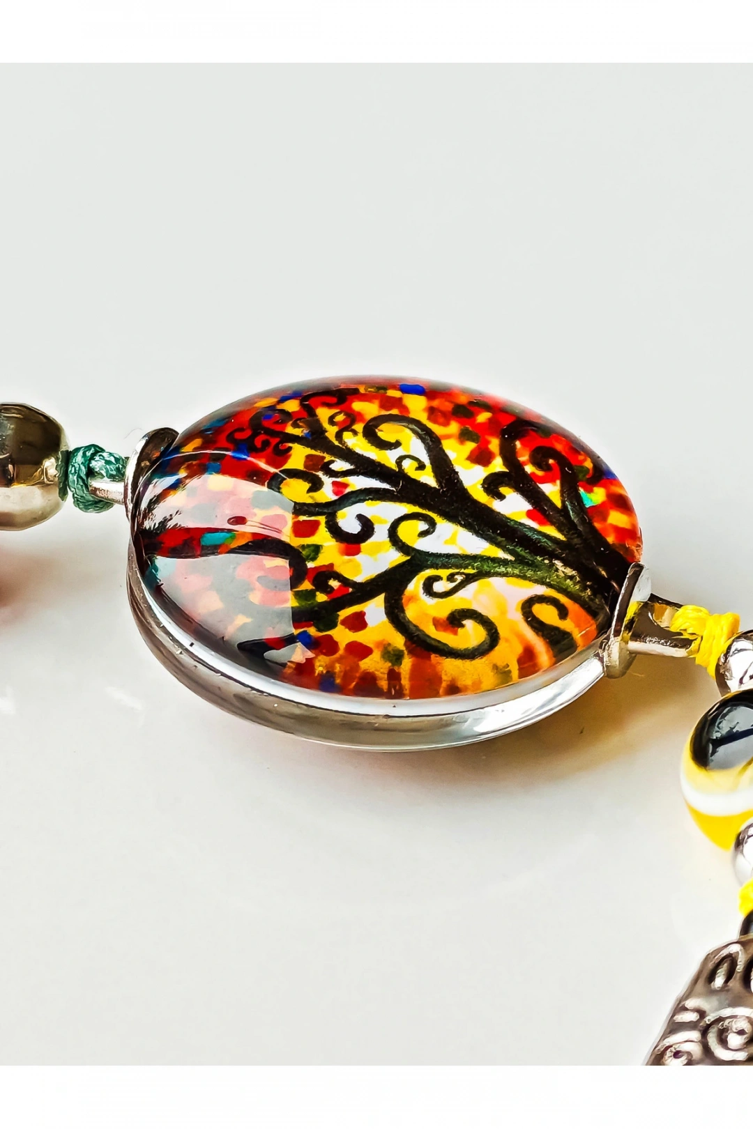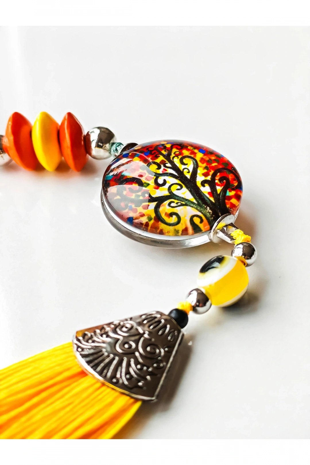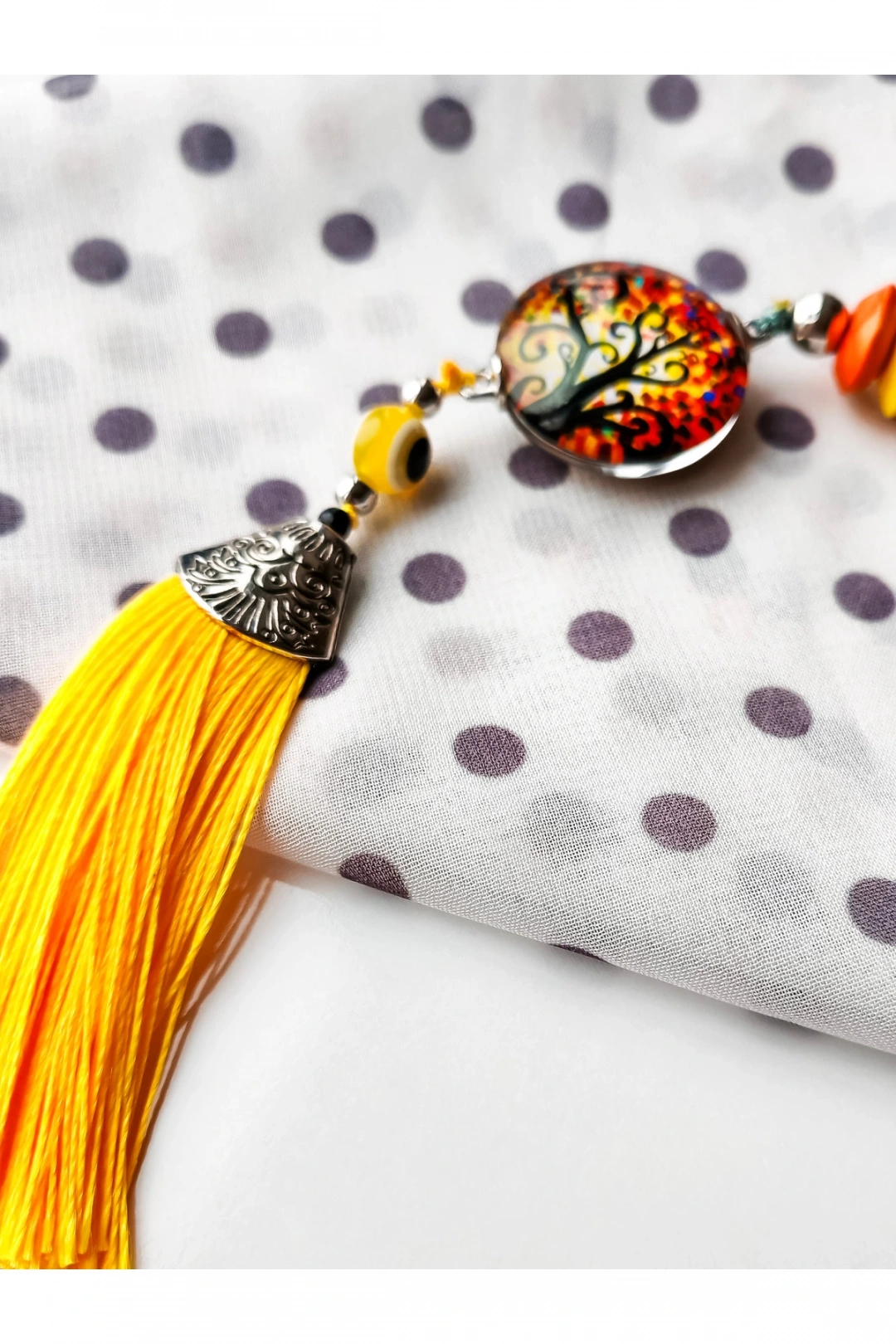 Sarı Cam Hayat Ağacı Desenli Sarı Püsküllü Anahtarlık