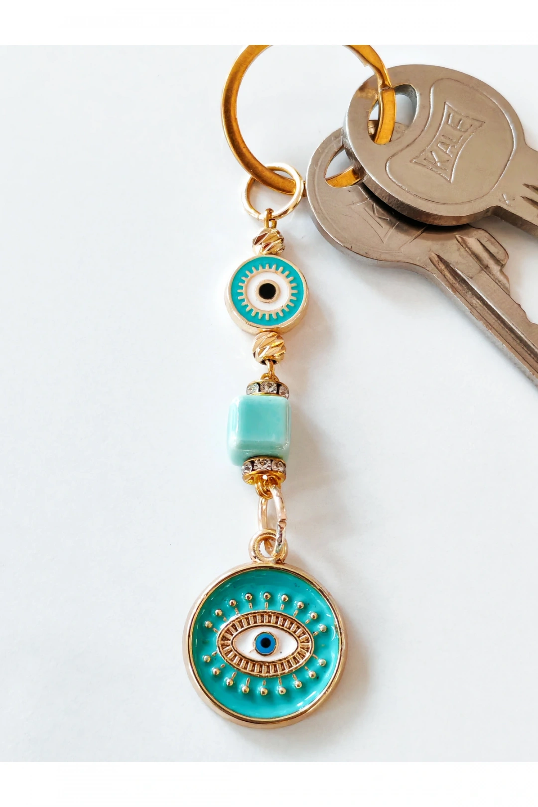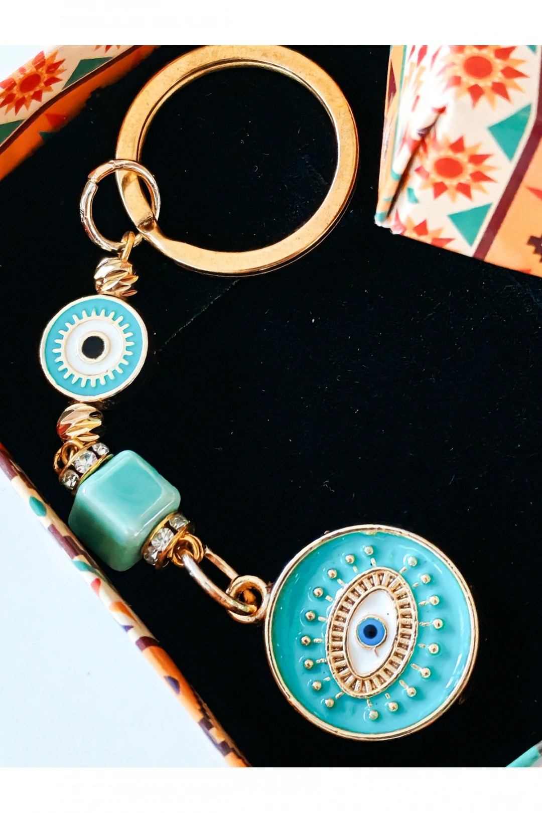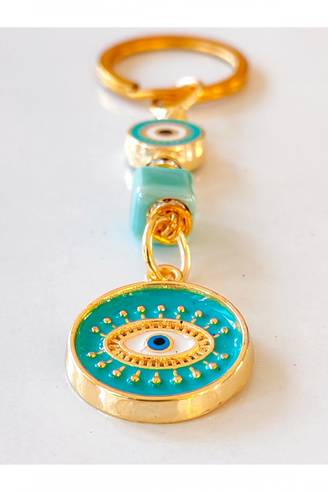Sarı Metal İçi Turkuaz Mavi Göz Desenli Anahtarlık – Şıklık ve Koruyucu Enerji Bir Arada