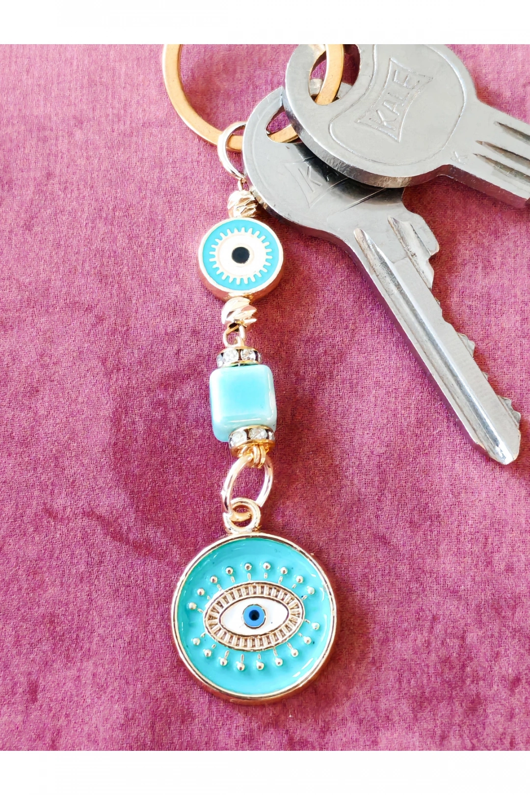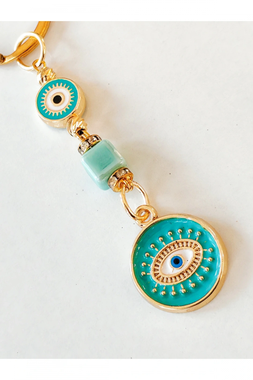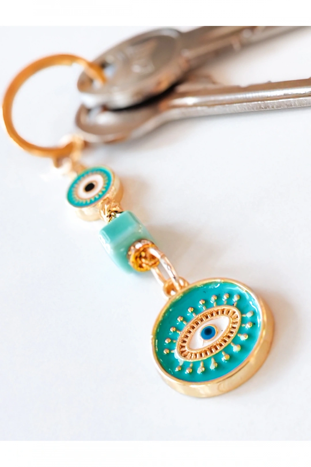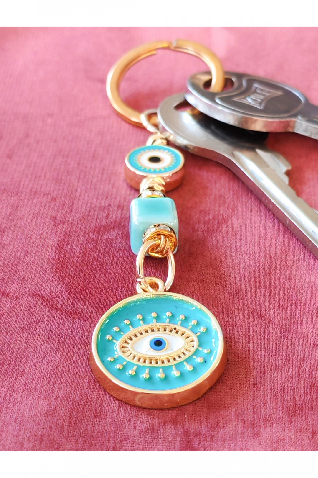 Sarı Metal İçi Turkuaz Mavi Göz Desenli Anahtarlık – Şıklık ve Koruyucu Enerji Bir Arada