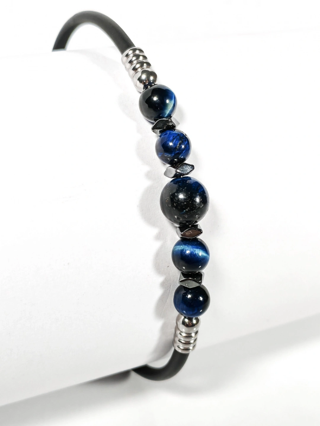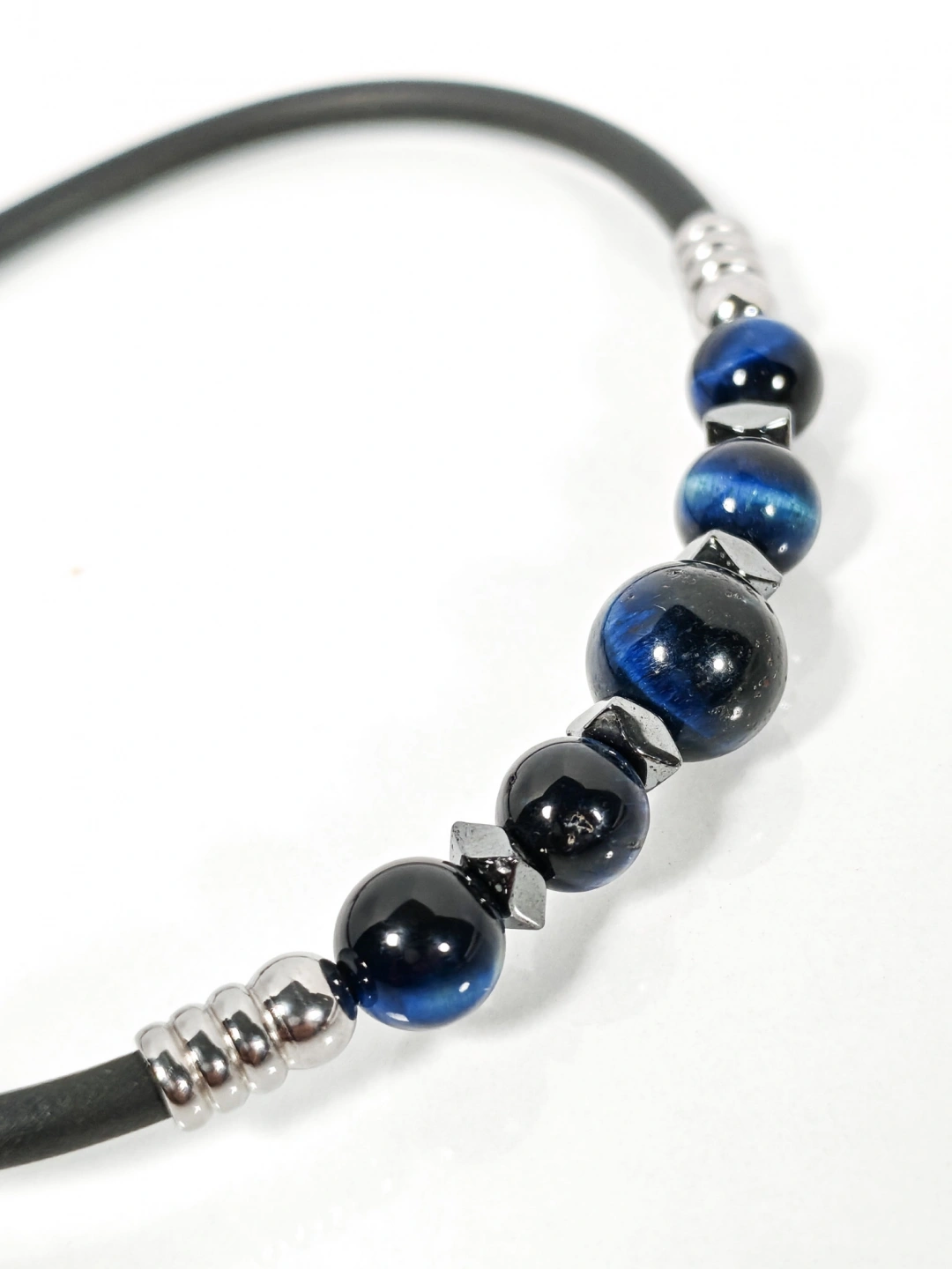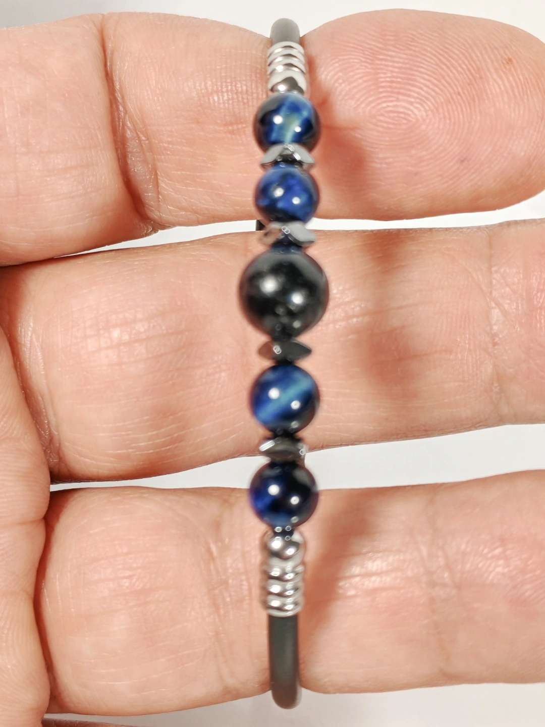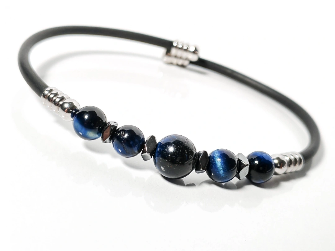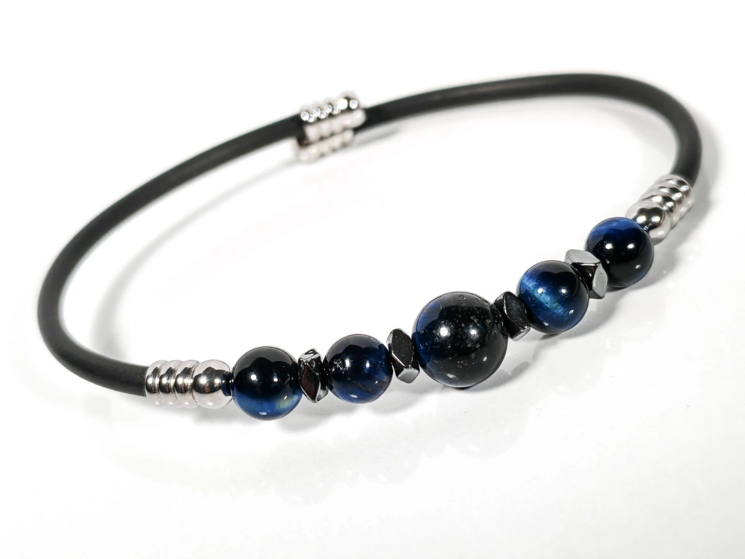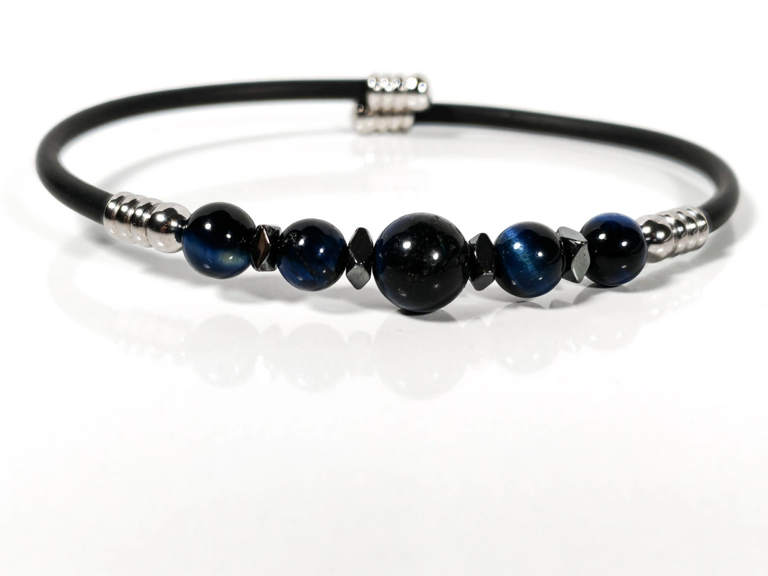 Sade siyah tasarımı ve mavi kaplan gözü, oniks ile hematit taş detaylarıyla öne çıkan bu bileklik, minimal ama karakterli bir stil arayanlar için özel olarak tasarlanmıştır. Mat siyah gövde ile parlak ve derin tonlara sahip doğal taşların uyumu, bilekliğe hem modern hem de zamansız bir görünüm kazandırır.