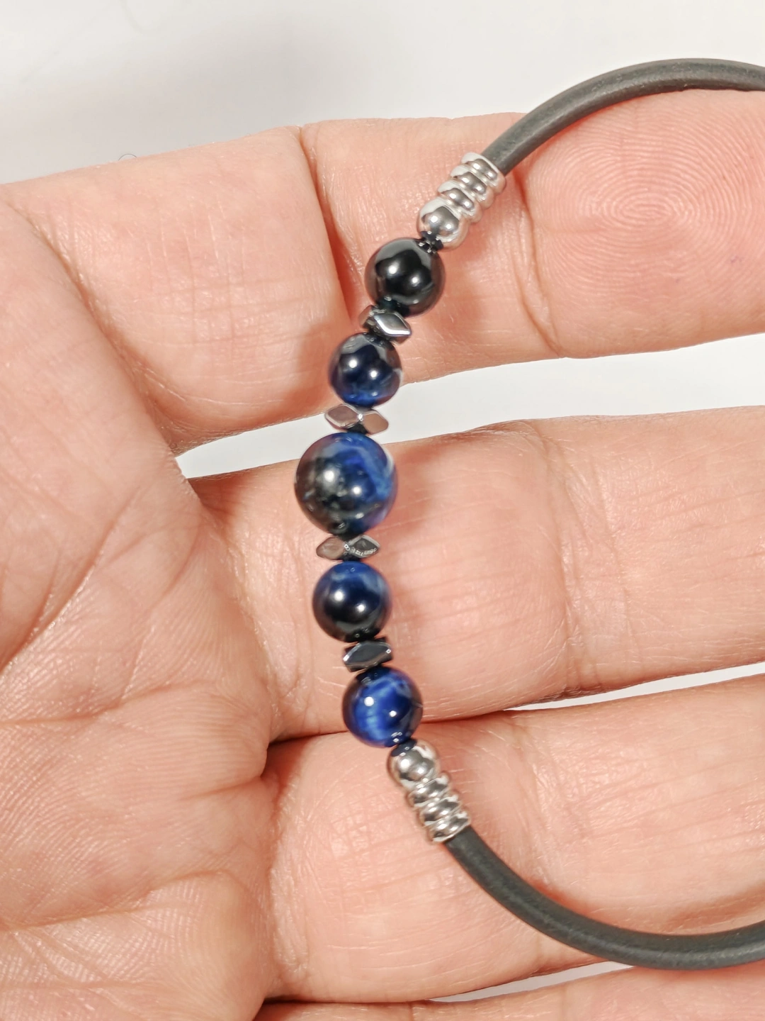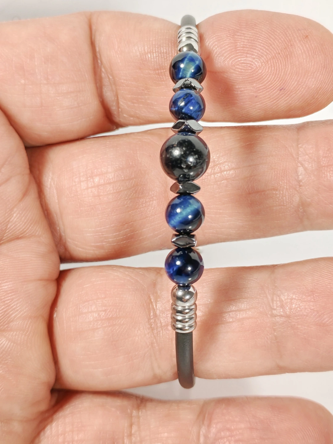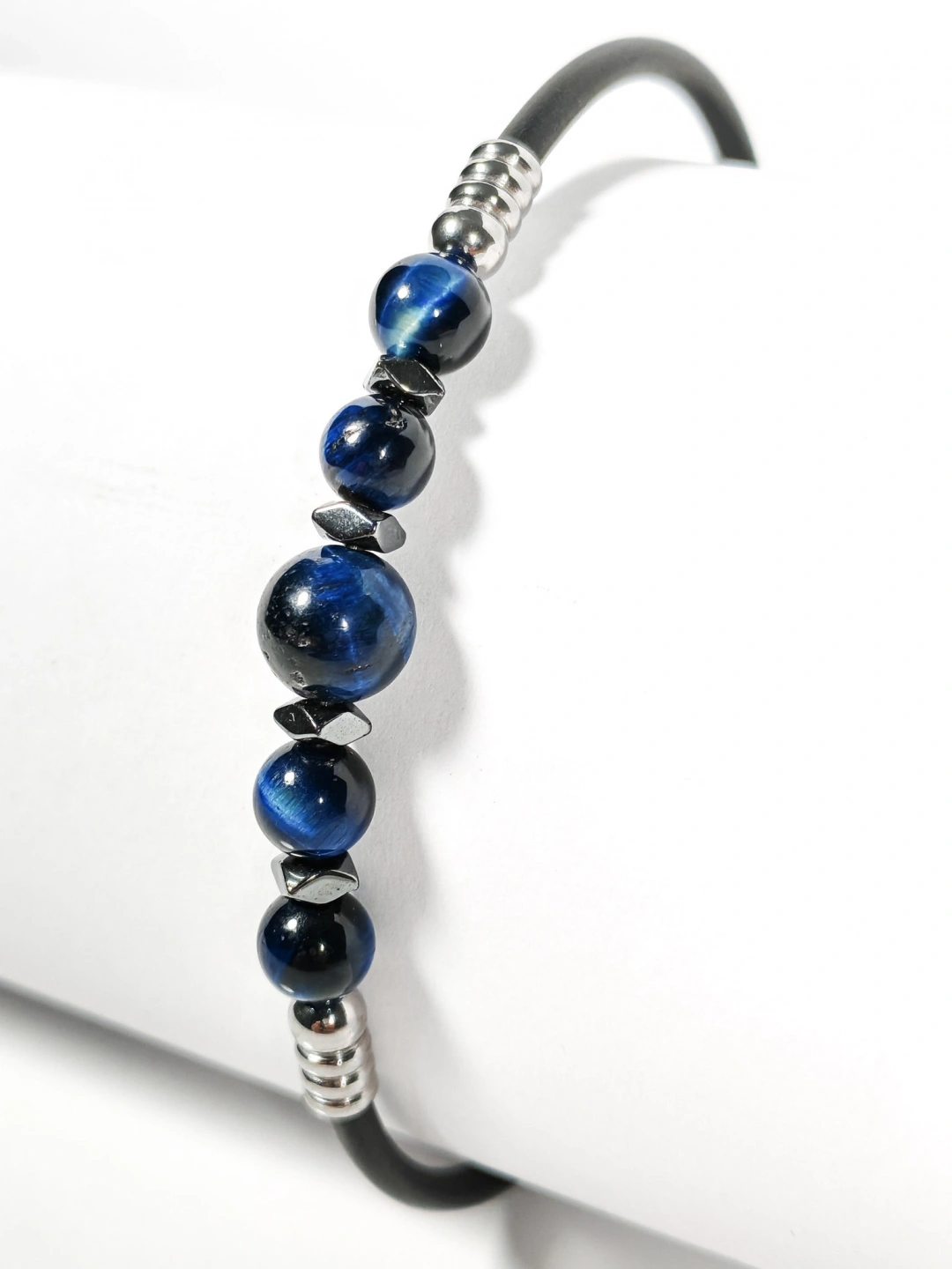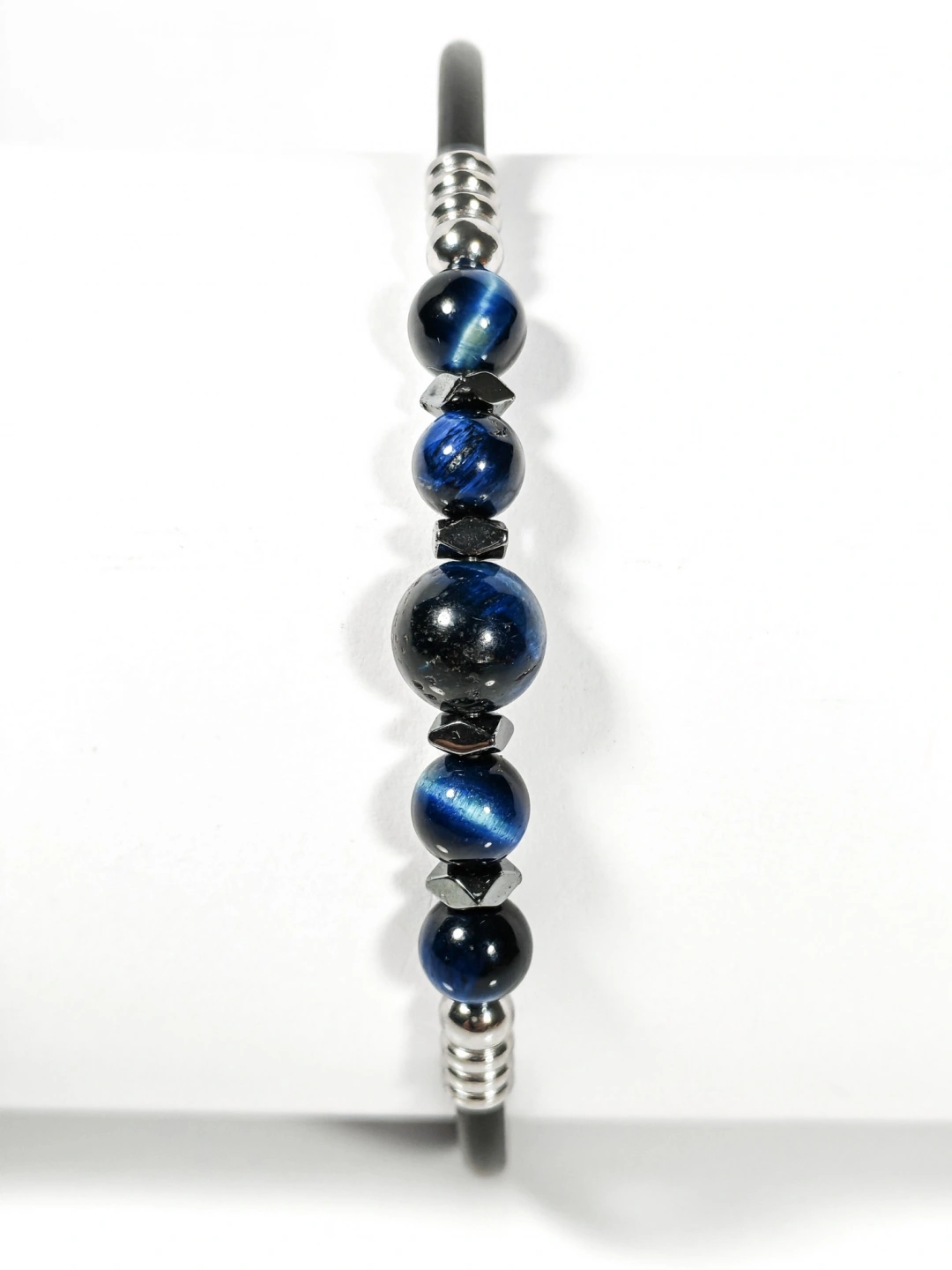 Sade siyah tasarımı ve mavi kaplan gözü taş detaylarıyla öne çıkan bu bileklik, hem estetik hem de enerjisel denge arayanlar için özel olarak tasarlanmıştır. Minimal formu sayesinde abartıdan uzak ama karakterli bir duruş sunar; modern ve zamansız bir stil yaratır.