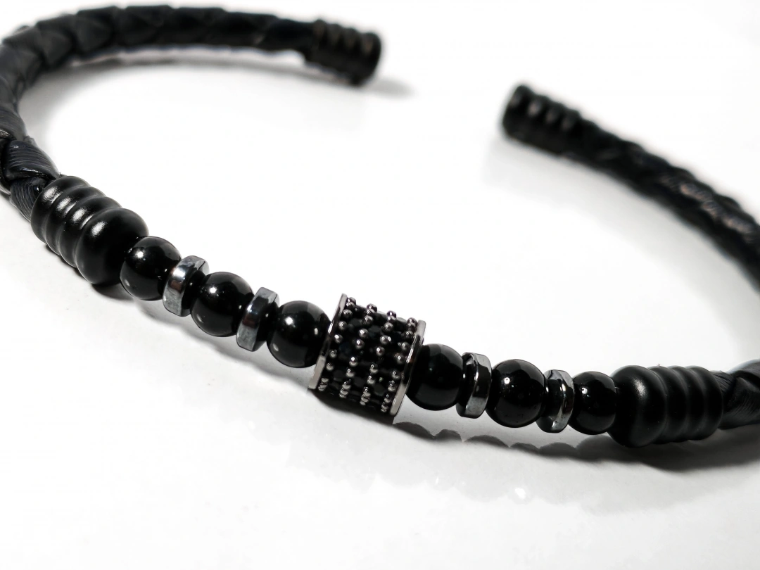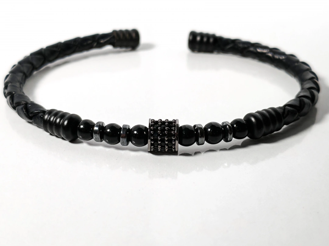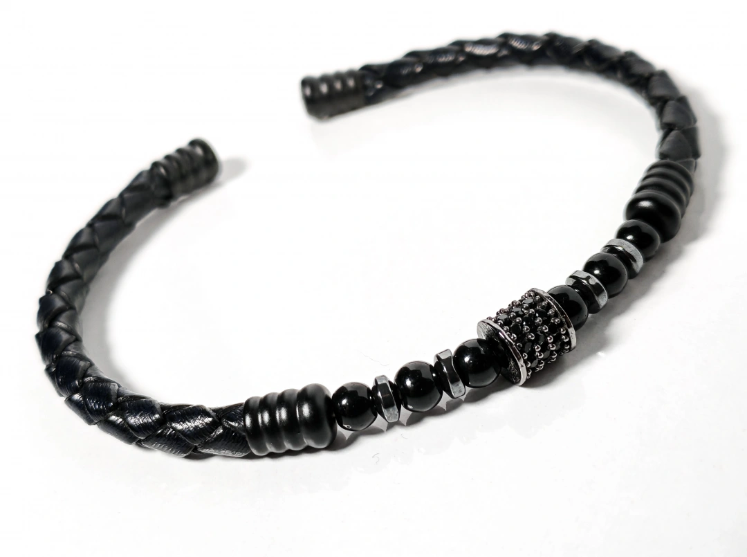 Doğal siyah tonu ve örgü deri tasarımıyla öne çıkan bu erkek bileklik, sade ama güçlü bir stil arayanlar için özel olarak tasarlanmıştır. Derinin doğal dokusu ile zirkon, hematit ve oniks taşların uyumu, bilekliğe hem modern hem de zamansız bir görünüm kazandırır.