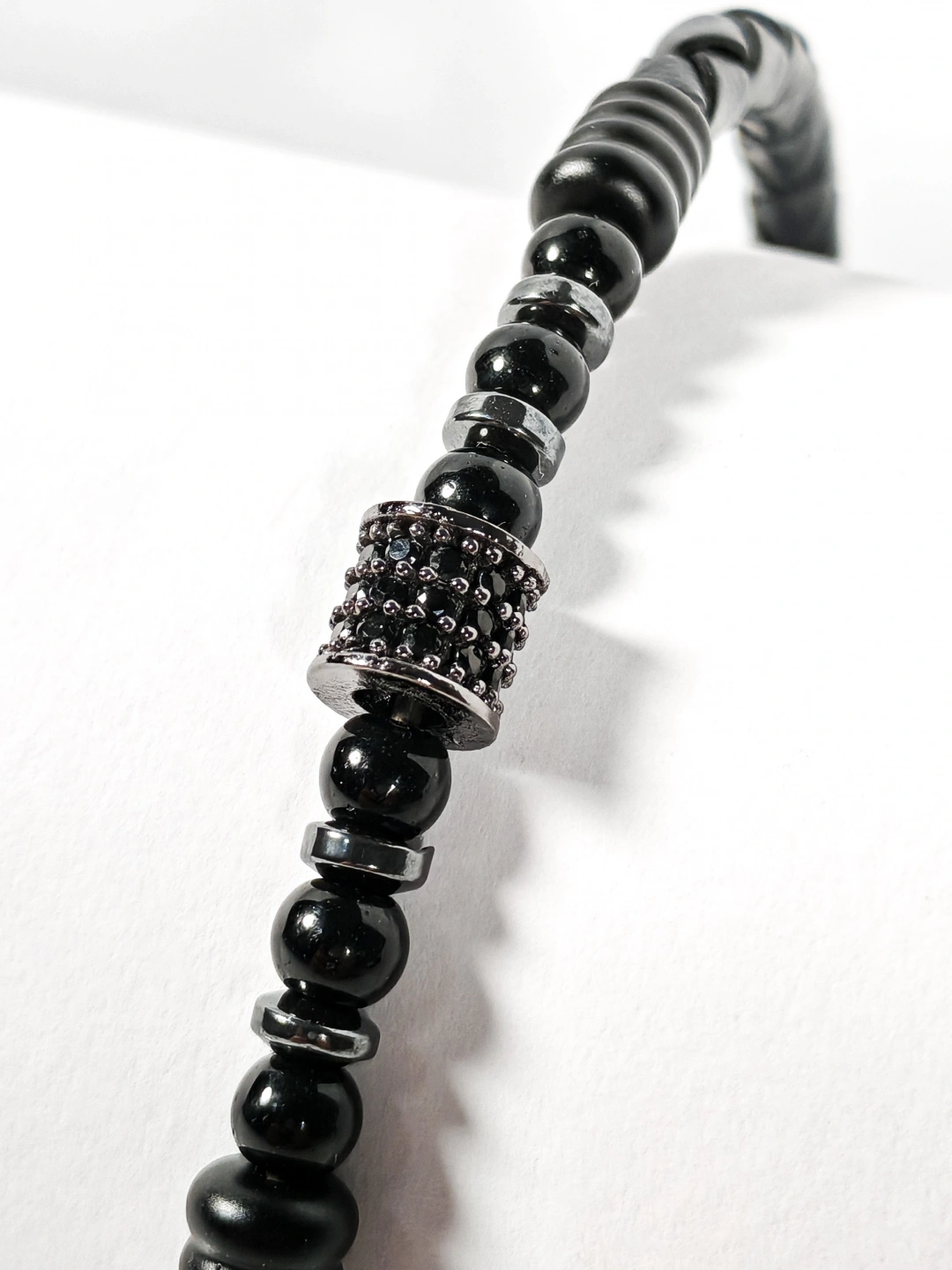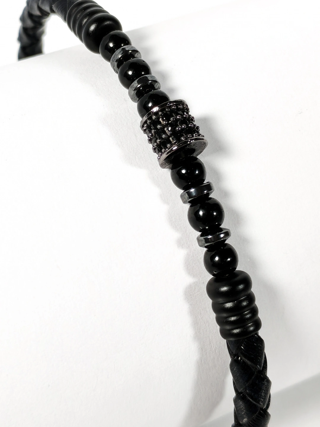 Siyah Örgü Deri ve Zirkon, Hematit, Oniks Taşlı Yaylı Erkek Bileklik – Doğal Şıklık ve Modern Detayların Uyumlu Buluşması