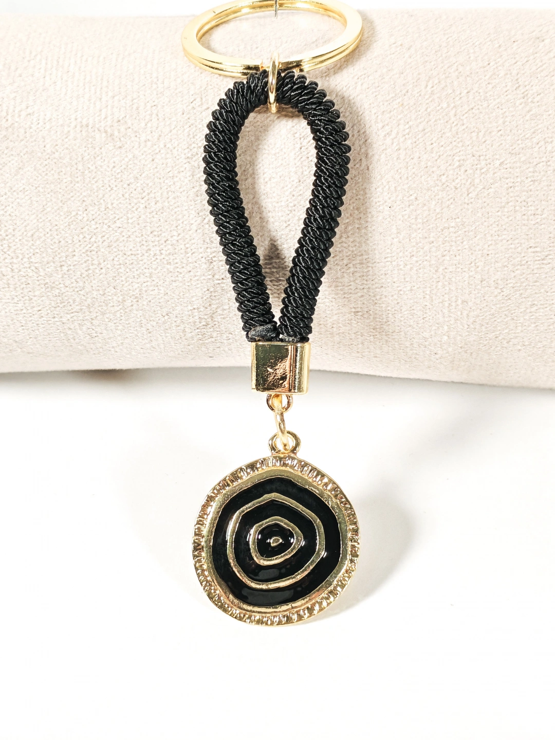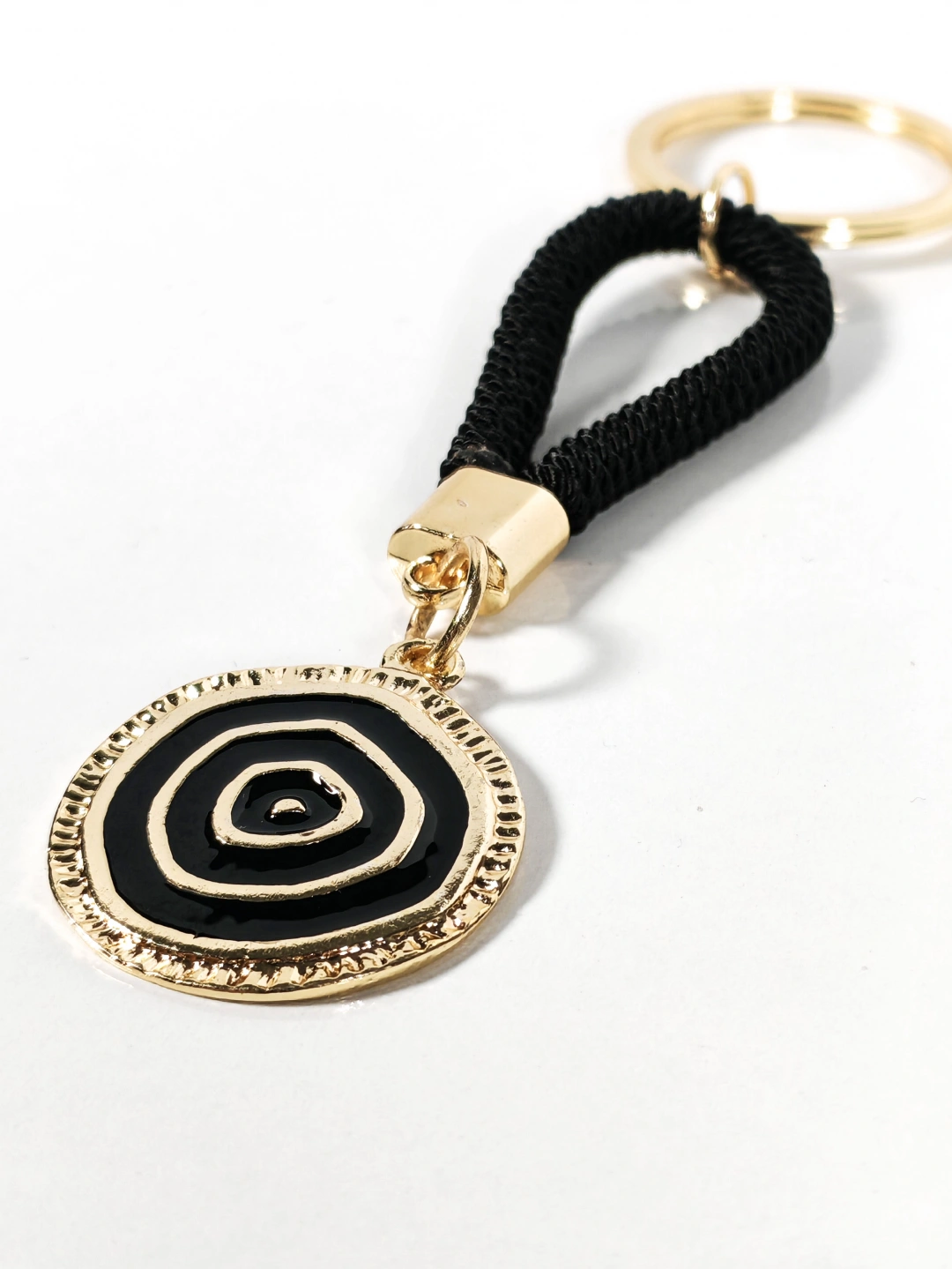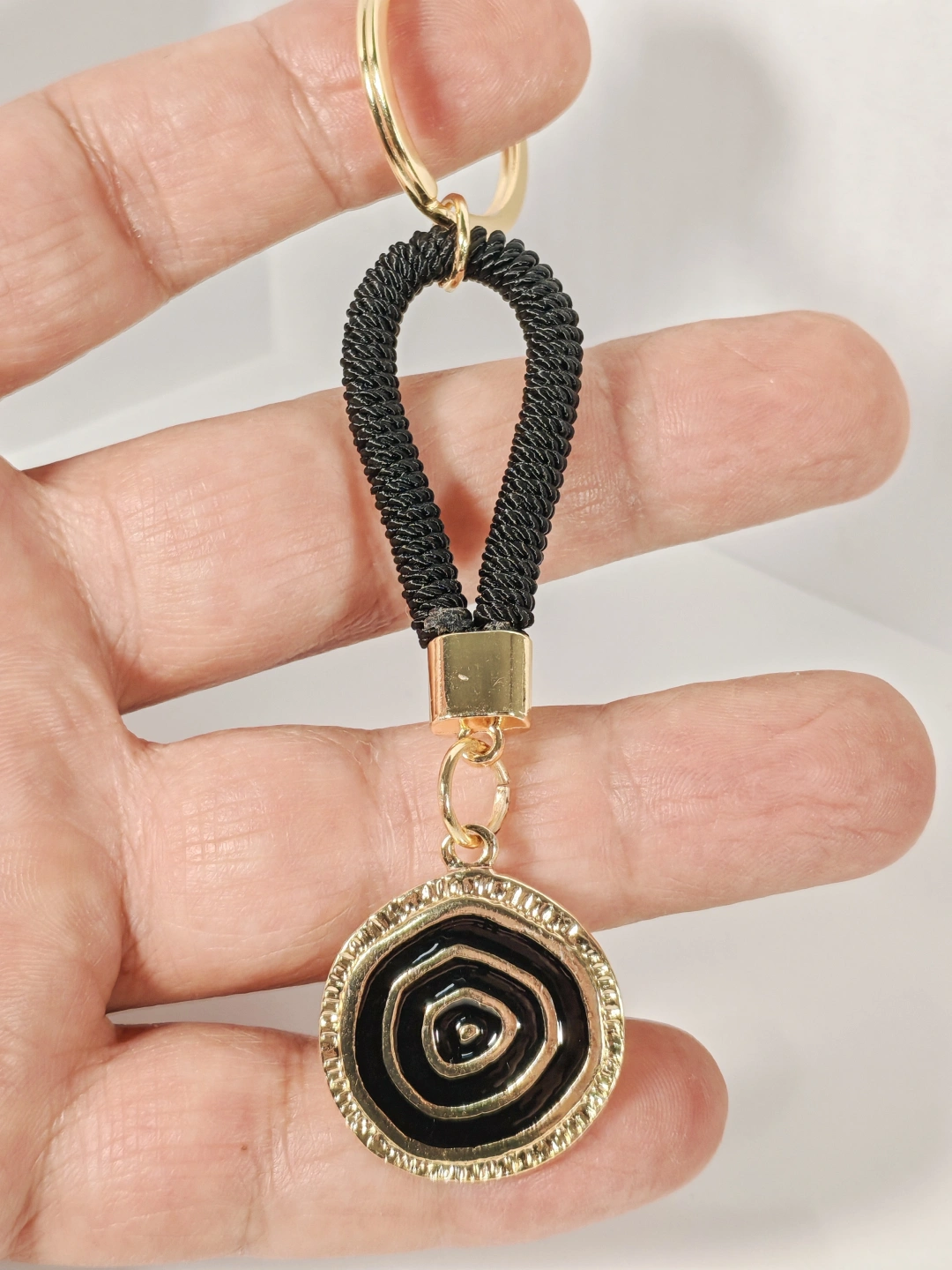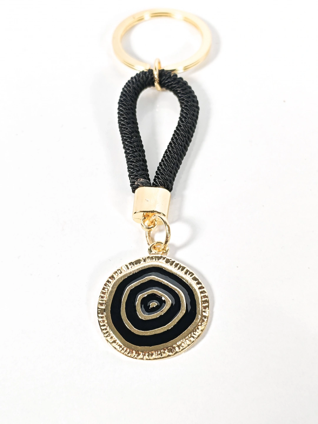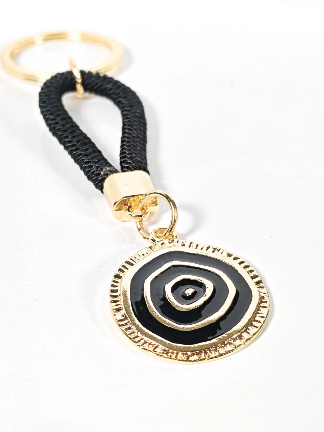Siyah örgü ip detayı ve altın tonlu yuvarlak nazar motifiyle tasarlanan bu anahtarlık; modern duruşu, sade çizgileri ve güçlü renk kontrastıyla dikkat çeken özel bir aksesuardır. Siyah rengin asaleti, altın tonlu metal detaylarla birleşerek hem günlük kullanımda hem de özel kombinlerde şık bir tamamlayıcı sunar. Minimal ama etkileyici tasarımıyla öne çıkar.