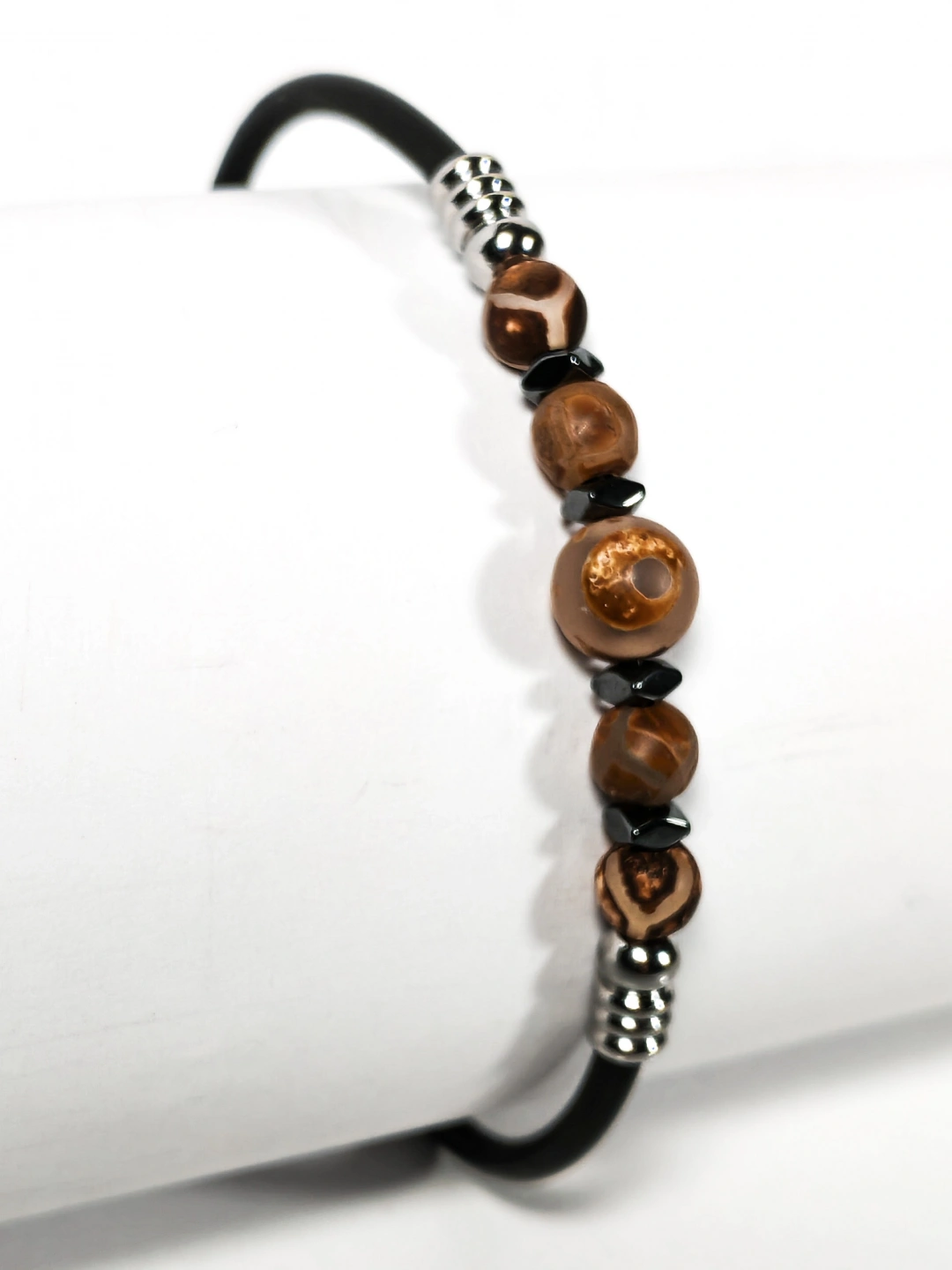 Toprak tonları ve karakteristik desenleriyle öne çıkan Tibet akik taşlarıyla tasarlanan bu yaylı bileklik, doğal estetiği güçlü bir anlamla buluşturur. Her bir akik taşının kendine özgü desenleri sayesinde her bileklik benzersiz bir görünüme sahiptir. Siyah yaylı kordon ile uyum sağlayan sıcak kahverengi tonlar, bileklikte dengeli ve zamansız bir şıklık sunar.
