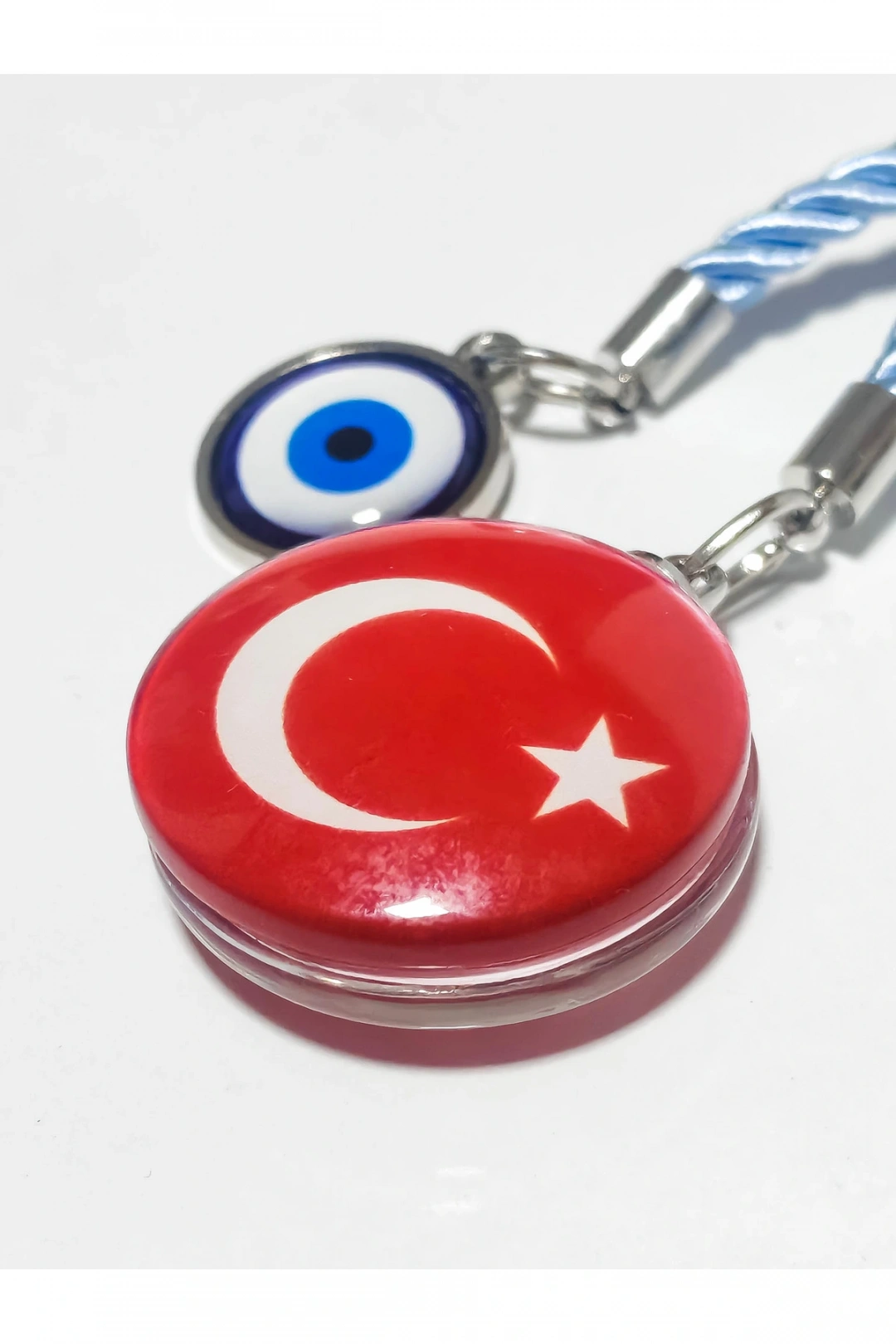 Türk Bayraklı Cam Boncuklu ve Nazar Boncuklu Anahtarlık – Vatan Sevgisi ve Koruyucu Enerjinin Buluşması