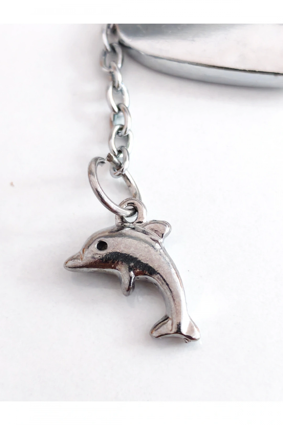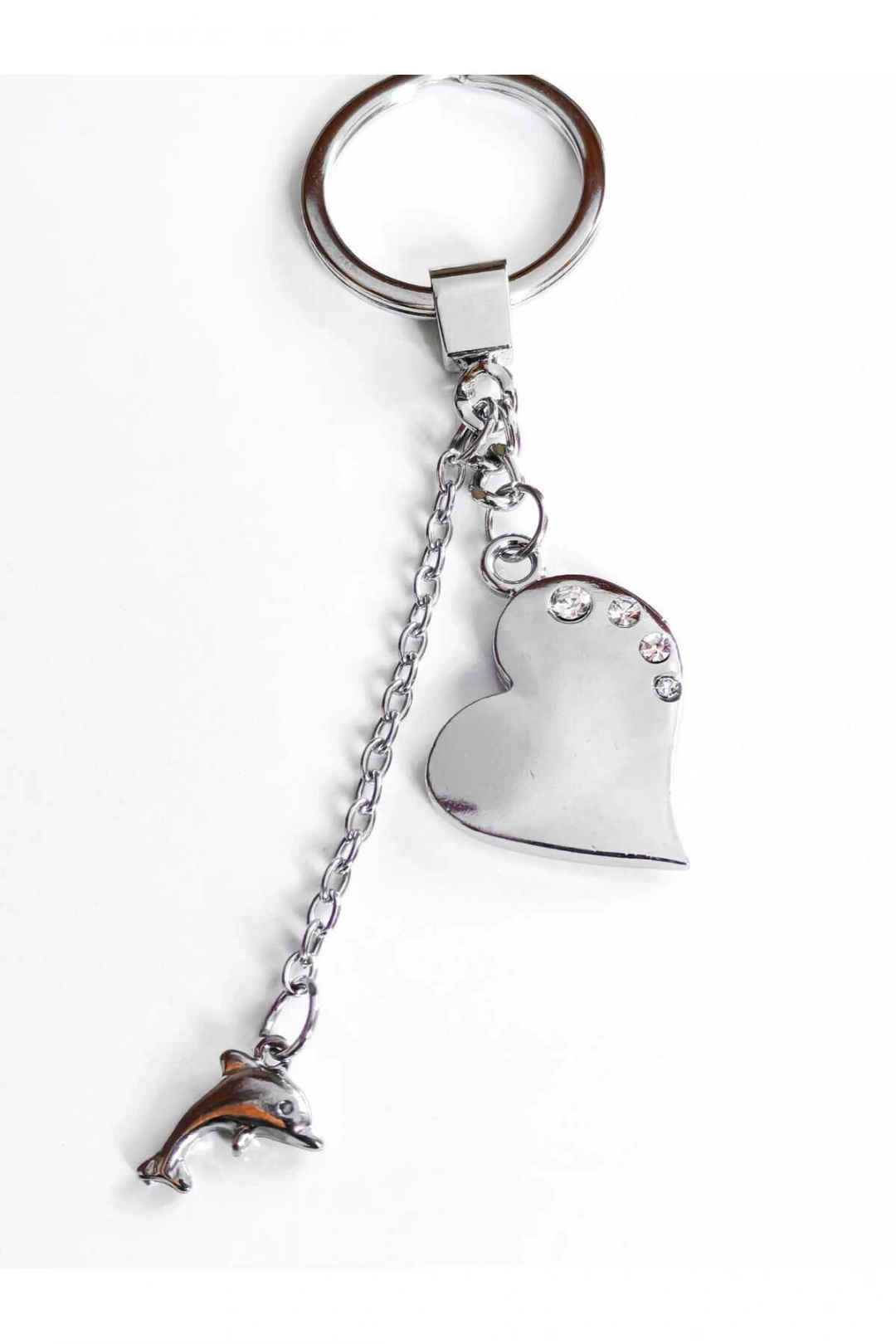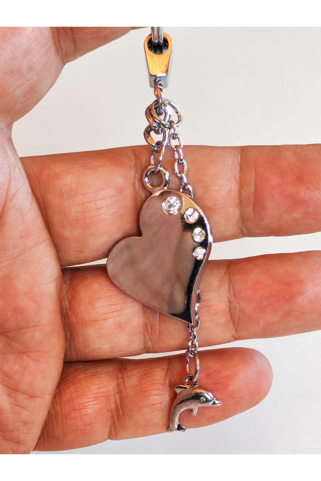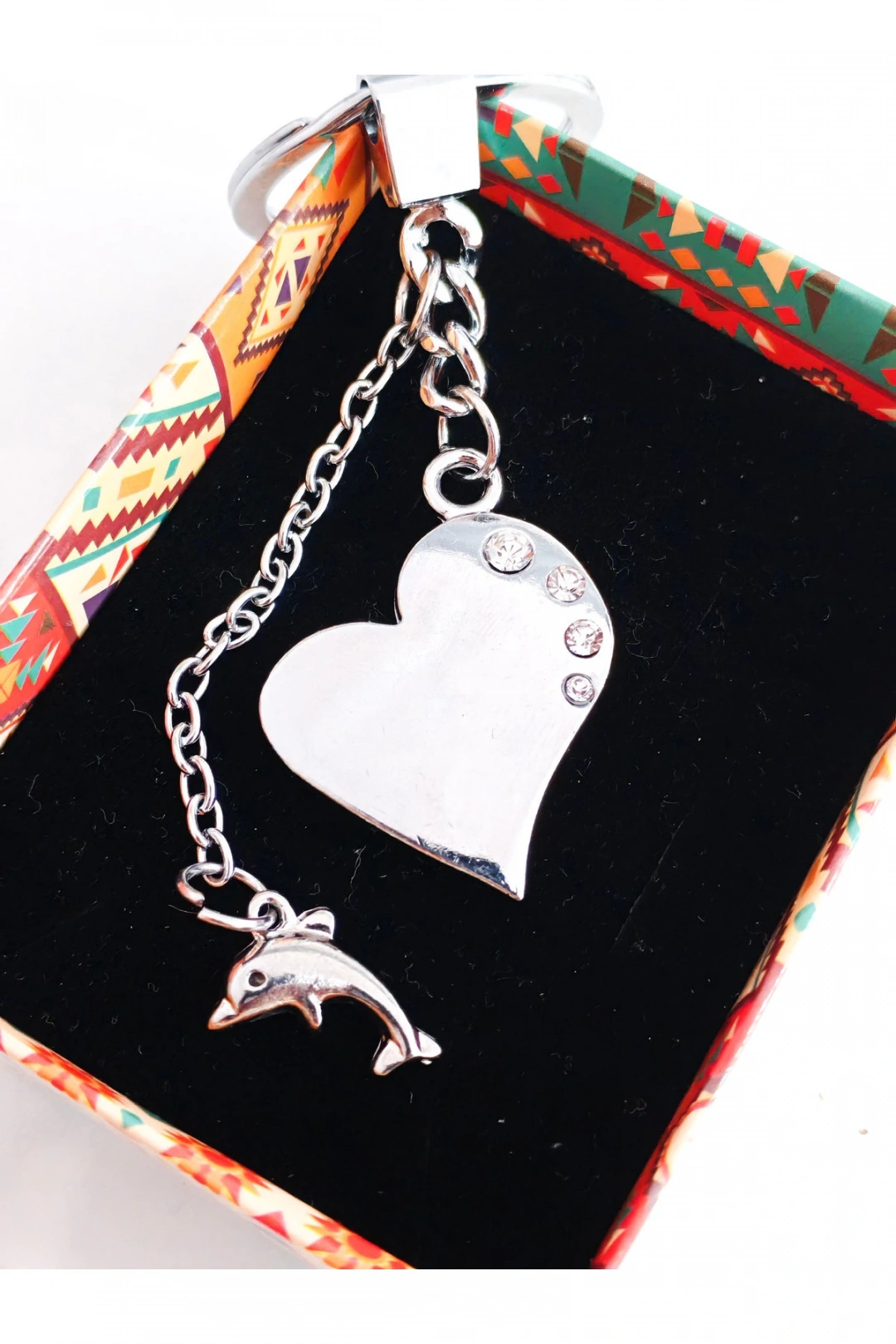 Üzeri Taşlı Kalp ve Zincir Ucunda Yunuslu Metal Anahtarlık – Şıklık ve Sevimliliğin Buluştuğu Tasarım