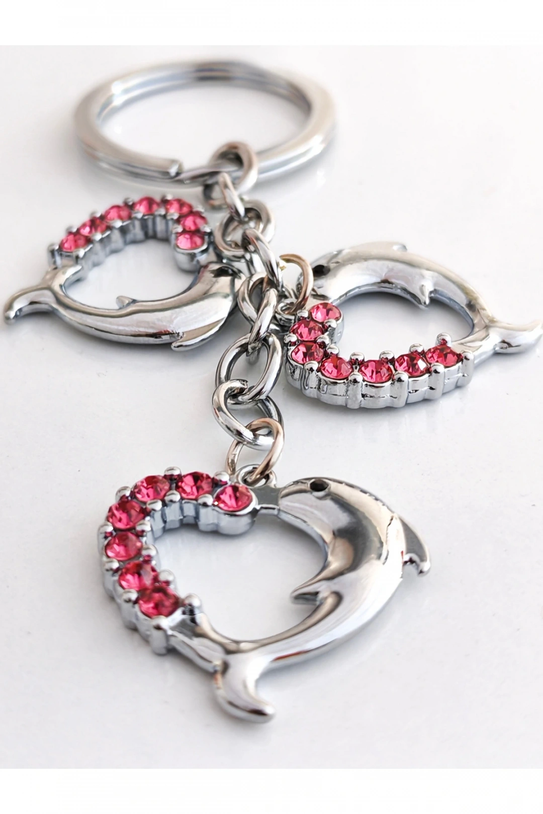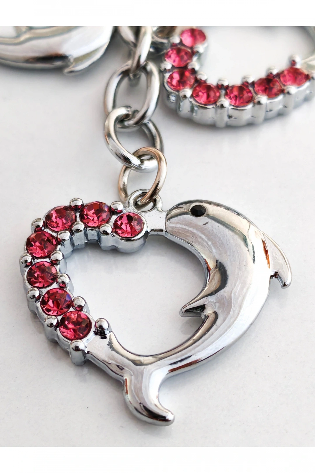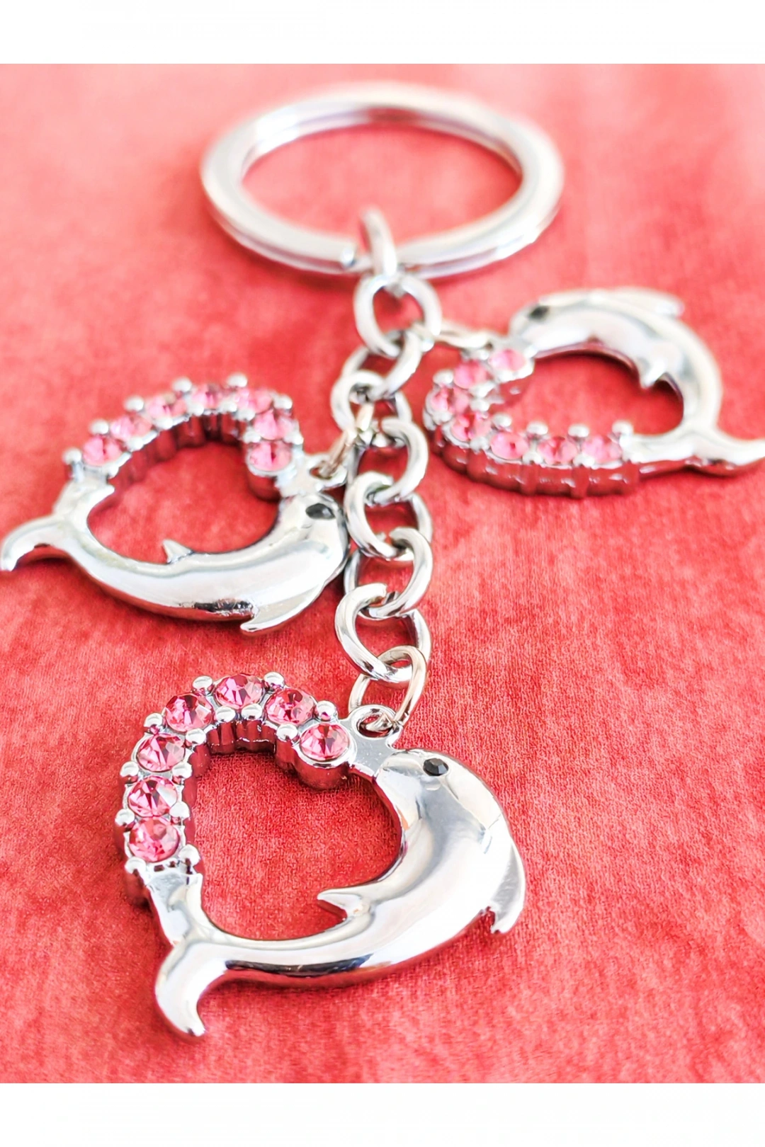 Yunus Balıklı Kalp Şeklinde Üzeri Pembe Taşlı Kalplerden Metal Anahtarlık – Aşkın ve Neşenin Simgesi