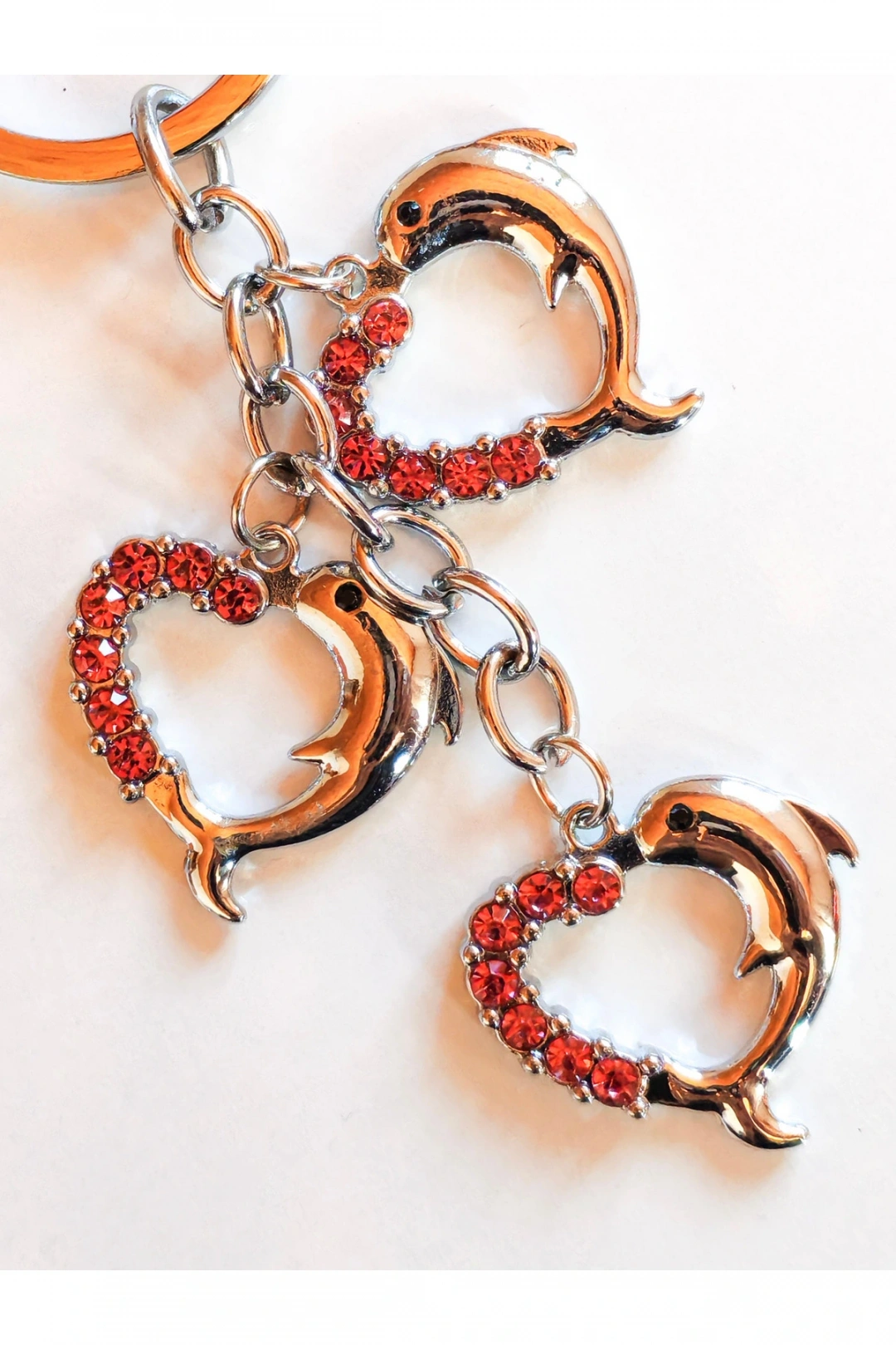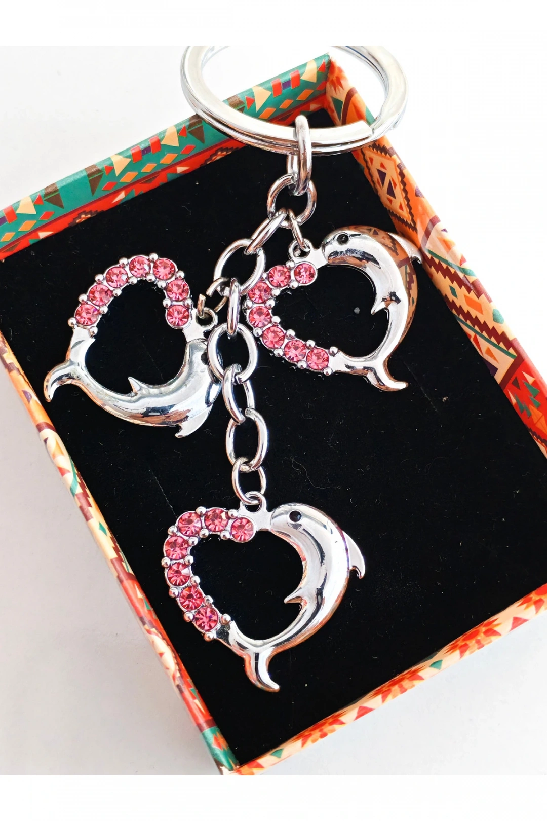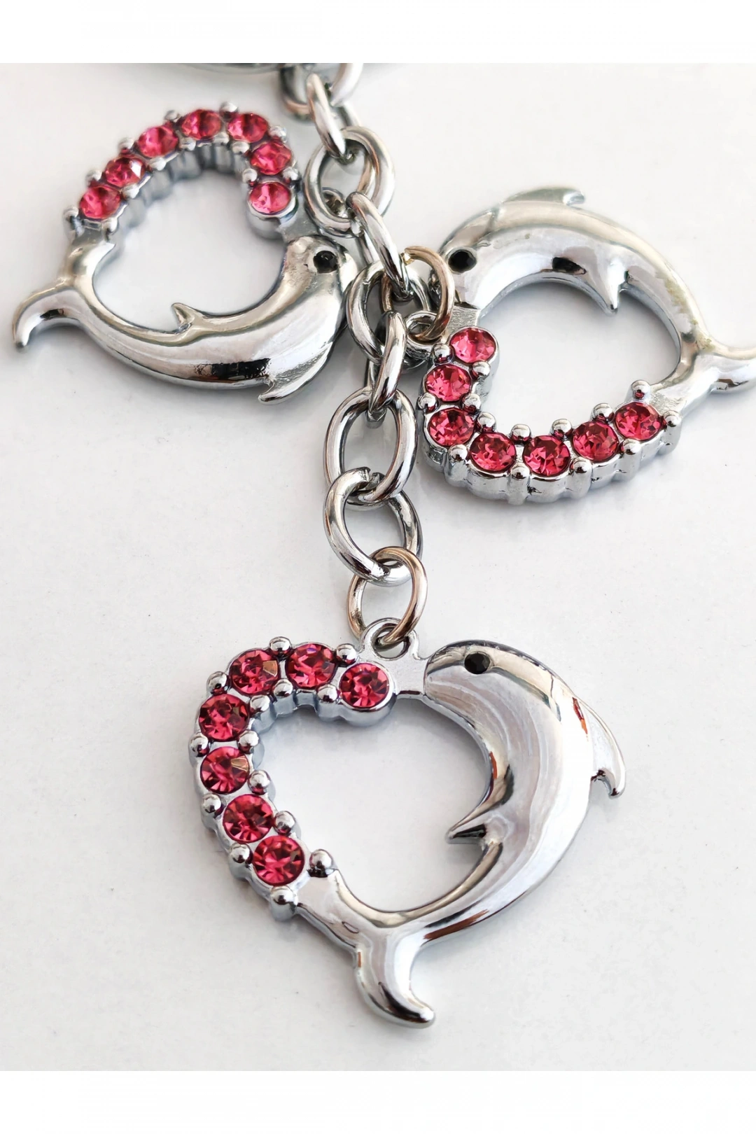 Yunus Balıklı Kalp Şeklinde Üzeri Pembe Taşlı Kalplerden Metal Anahtarlık – Aşkın ve Neşenin Simgesi