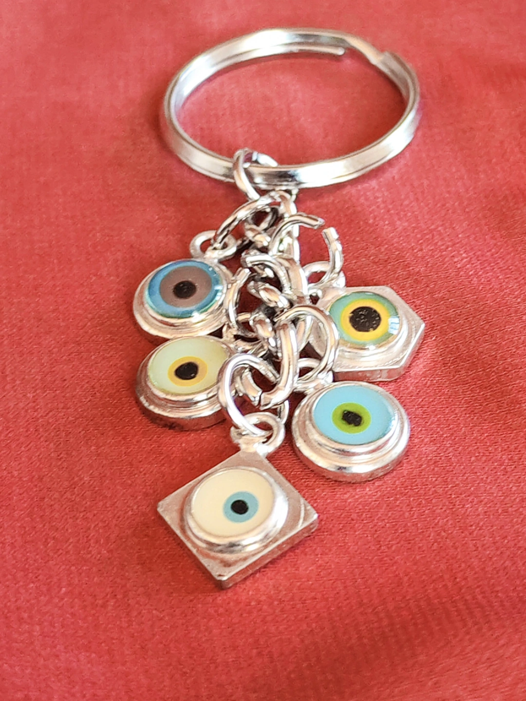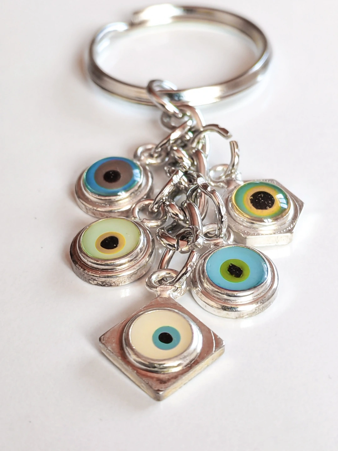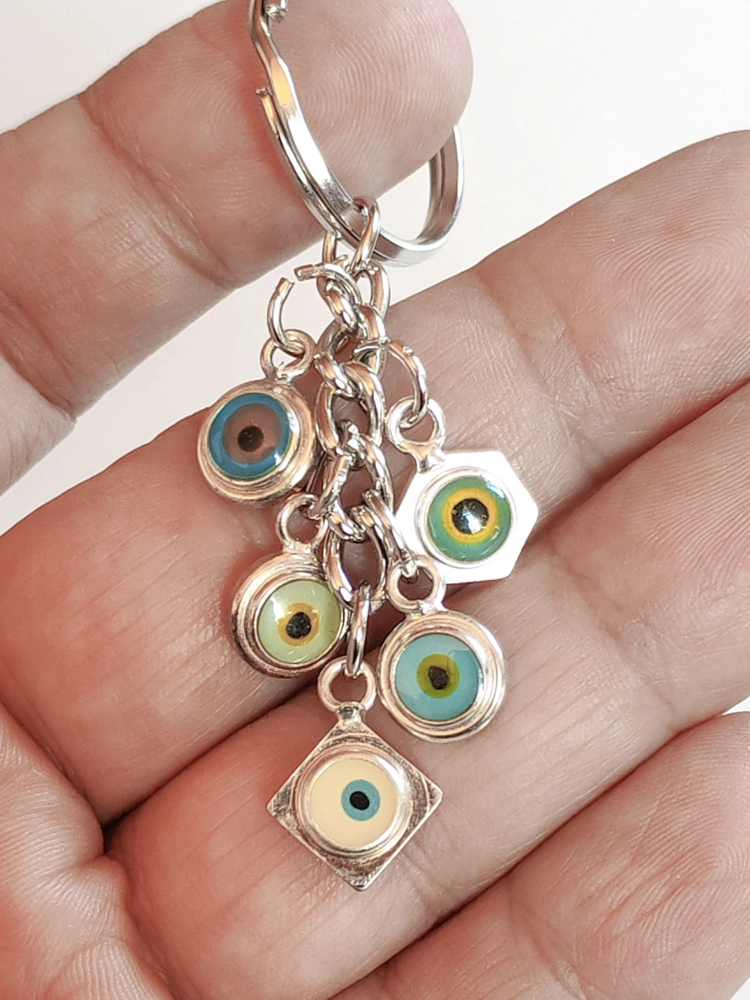 Renkli ve anlamlı tasarımıyla dikkat çeken zincirli farklı renklerde küçük cam gözlerden oluşan metal anahtarlık, hem estetik hem de koruyucu bir aksesuar olarak öne çıkıyor. Nazar boncuğu formundaki küçük cam gözler, her biri farklı renkte tasarlanarak ayrı zincirlere bağlanmış ve böylece hareketli, canlı bir görünüm kazandırılmıştır. Anahtarlarınıza, çantanıza ya da aracınıza taktığınızda hem şık hem de dikkat çekici bir detay sunar.