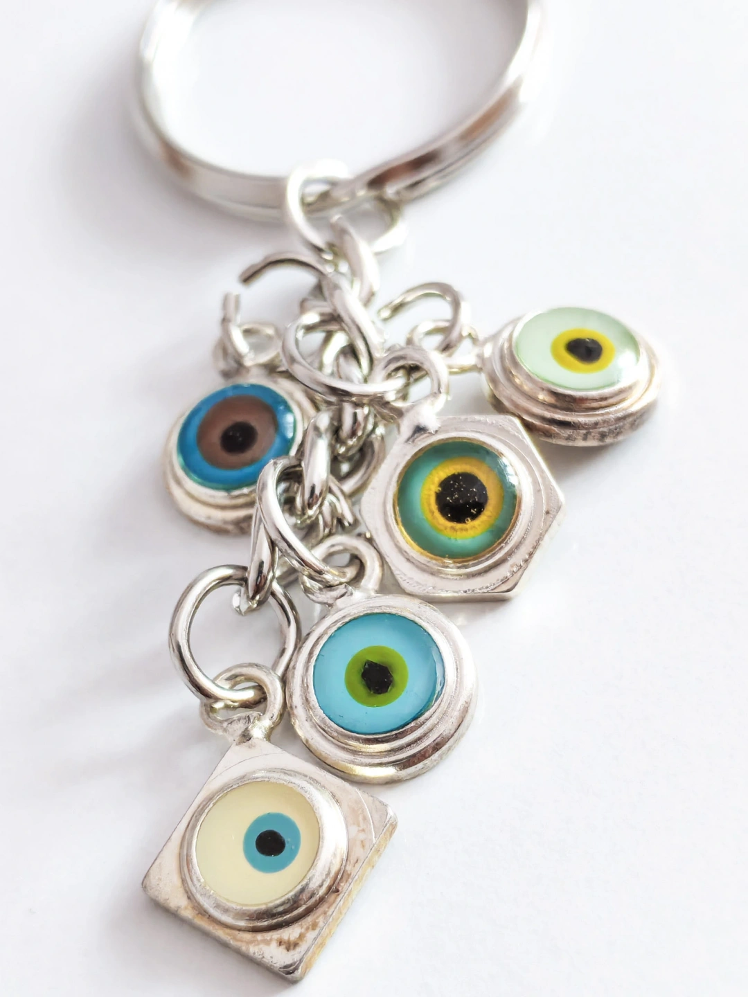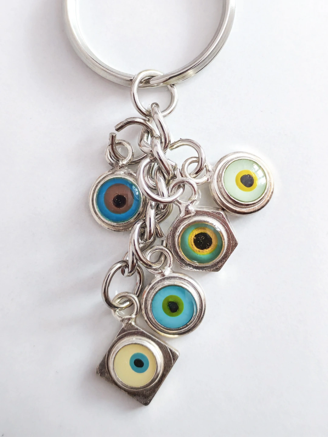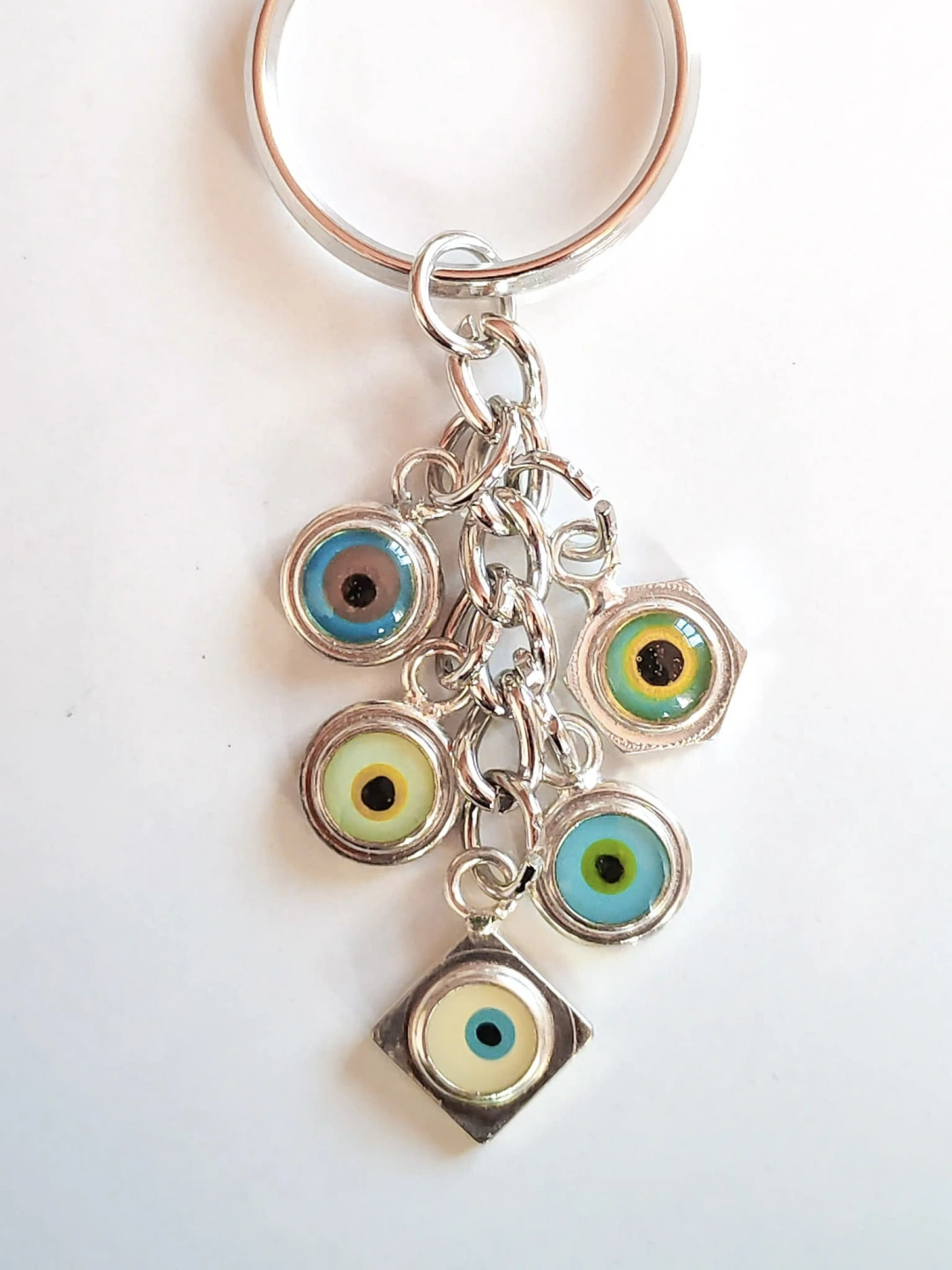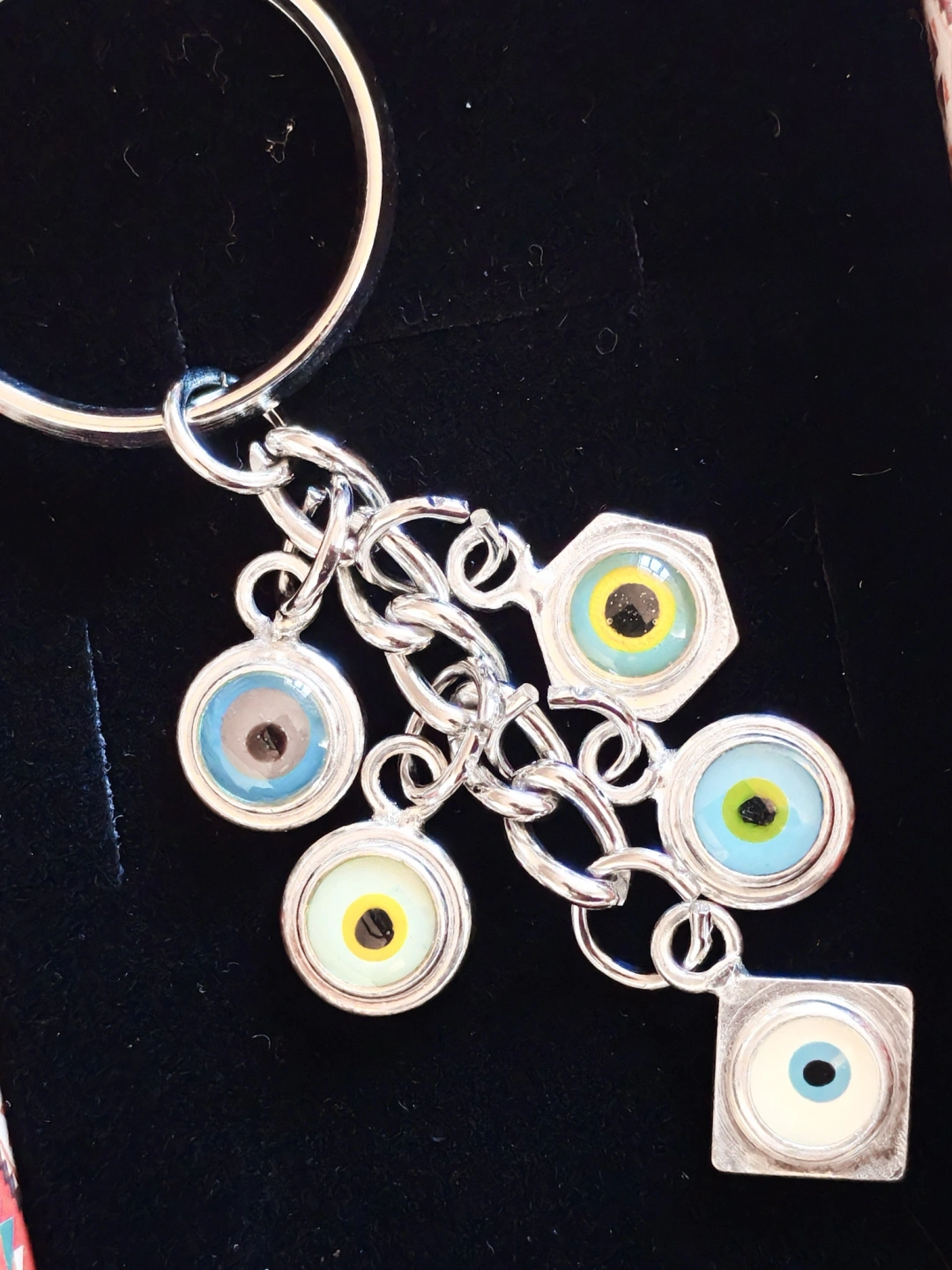 Renkli ve anlamlı tasarımıyla dikkat çeken zincirli farklı renklerde küçük cam gözlerden oluşan metal anahtarlık, hem estetik hem de koruyucu bir aksesuar olarak öne çıkıyor. Nazar boncuğu formundaki küçük cam gözler, her biri farklı renkte tasarlanarak ayrı zincirlere bağlanmış ve böylece hareketli, canlı bir görünüm kazandırılmıştır. Anahtarlarınıza, çantanıza ya da aracınıza taktığınızda hem şık hem de dikkat çekici bir detay sunar.